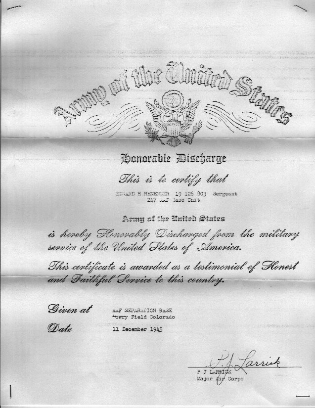 Edward Henry Renenger Discharge Papers Pg 1