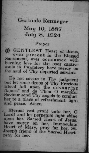 Gertrude Fienhage married John Jacob Rennenger on July 16, 1907 at St. Mary's Church in St. Benedict, Kansas. To this union were born eleven boys and four girls for a total of 15 children.