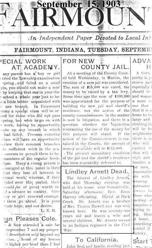 The funeral of Lindley Arnett who died Thurday evening, was held at his home, near Summitville, Saturday afternoon; Rev. Enos Harvey officiating. Burial at Back Creek. Mr. Arnett was a brother of Mrs. Thurza Howell and was well known here. He was seventy-one years old and leaves a wife and several children. Mr. Arnett served in an Indiana regiment in teh Civil War.