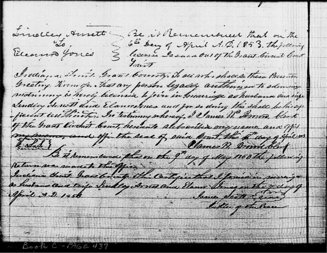 Indiana To-wit: Grant County. To all who shall see these presents, Greetings. Know ye that any person legally authorized to solemnize matrimony is hereby licensed to join in marriage as husband and wife Lindley Arnett and Elanor Jones and for so doing this shall be his sufficient authority. In testimony whereof, I James W. Brown, Clerk of the Grant Circuit Court hereunto subscribe my name and office (next words scratched out by author- my name and office) the seal of said Court this 6th day of April 1853.