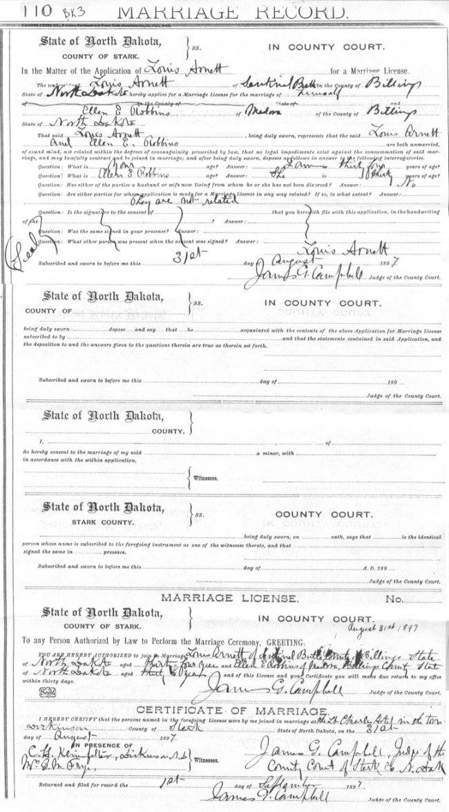 Louis Arnett and Ellen Ellsworth Robbins Marriage Application and Record