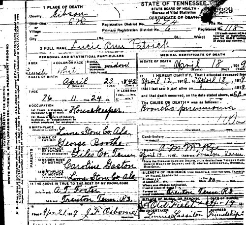 Lucy Patrick's Death Certificate