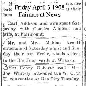 Mr. and Mrs. Mahlon Arnett entertained Saturday night and Sunday their son Verlie, who is a clerk at the Big Four Wards at Wabash.