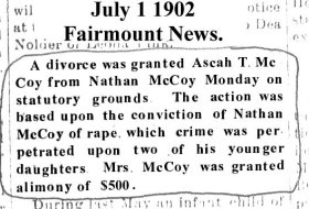 A divorce was granted to Aschah T. McCoy from Nathan McCoy Monday on statutory ground. The action was based upon the conviction of Nathan McCoy of rape, which crime was perpetrated upon two of his younger daughters. Mrs McCoy was granted alimony of $500.