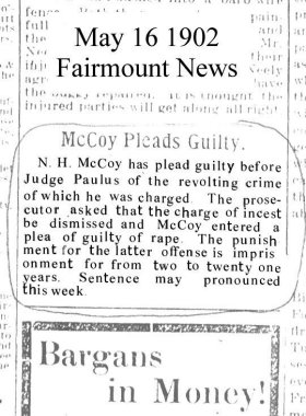 N. H. McCoy has plead guilty before Judge Paulus of the revolting crime of which he was charged. The prosecutor asked that the charge of incest be dismissed and McCoy entered a plea of guilty of rape. The punishment for from two to twenty one years. Sentence may pronounced this week. (typed as appeared in paper)
