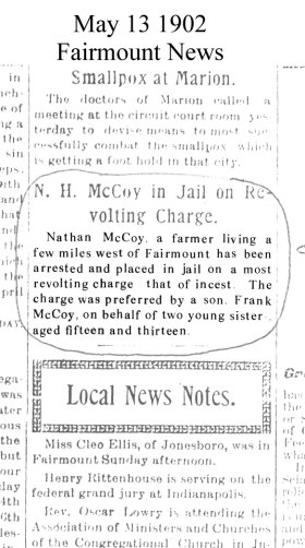 Nathan McCoy, a farmer living a few miles west of Fairmount has been arrested and placed in jail on a most revolting charge that of incest. The charge was preferred by a son, Frank McCoy, on behalf of two young sisters, aged fifteen and thirteen.