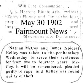Nathan McCoy and James (Spider) Kelley was taken to the penitentiary Wednesday to serve their sentences for from two to fourteen years. McCoy, it will be remembered, pleaded guilty to rape, and Kelley was found guilty of theft.