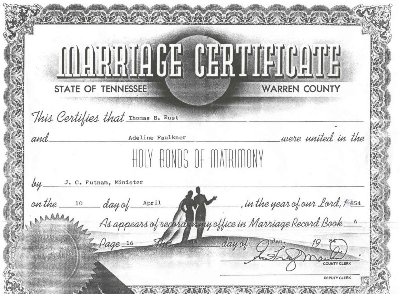 Thomas B. Rust and Adeline Faulkner Marriage Certificate